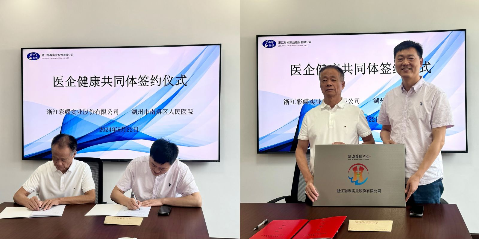 8月22日上午,醫(yī)企健康共同體簽約暨授牌儀式在浙江彩蝶實業(yè)股份有限公司舉行,湖州市南潯區(qū)人民醫(yī)院黨委書記毛建強,黨委
